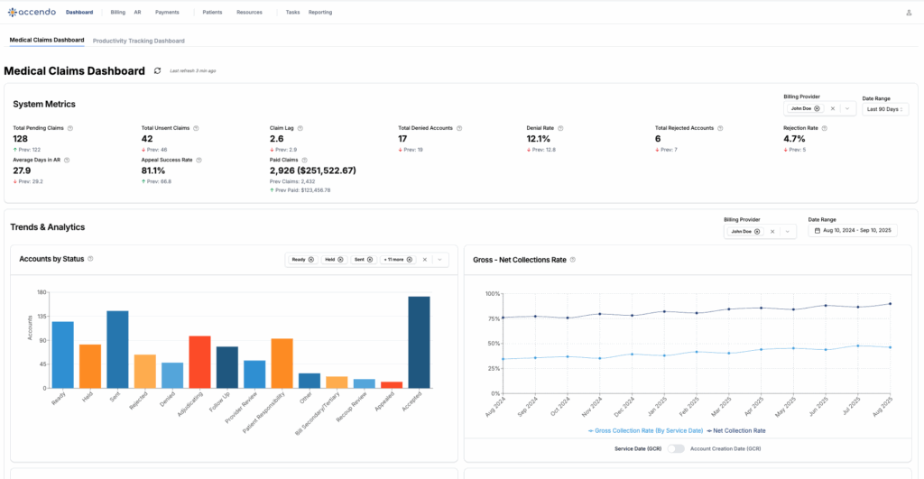 Accendo Dashboard Reporting gives you complete visibility into your claims and revenue cycle. With an all-in-one dashboard, you can monitor claims across providers and payers, track edits, and measure key performance indicators in real time. Stay on top of performance with deep insights into financial outcomes, operational efficiency, and claim trends—transforming complex data into confident decisions.