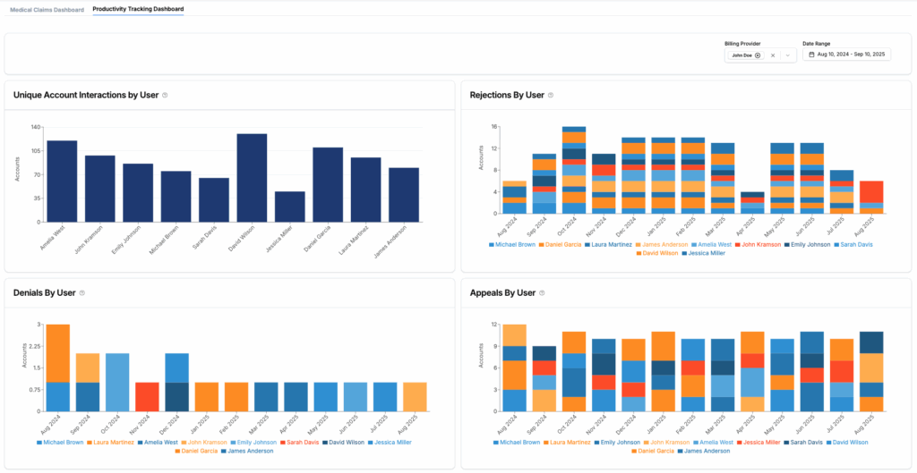 Accendo Productivity Insights helps your team work smarter, not harder. Assign claims seamlessly between team members, track progress across your workforce, and optimize efficiency at every step. With clear visibility into claim edits and performance metrics, you can manage workloads, identify bottlenecks, and ensure your team is delivering at its highest potential. Gain the insights you need to turn productivity into profitability.